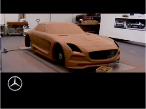 デザインが決定すると、クレイ(工業用粘土)を使ってクレイモデラーが立体化します。スケールモデル(縮尺模型)からフルサイズのモデル、室内のモデルも造形してデザインの検討を行います。クレイモデルは、デザイン面や空力特性、使い勝手など、さまざまな要素を検討するための目安になる重要なものです。室内のモデルは、実際に乗車してデザインの検討や操作性などを確認するために使用されます。木を削る工具で加工したり、皮を巻いて縫製をしたりと本物の自動車と同じ質感に仕上げていきます。